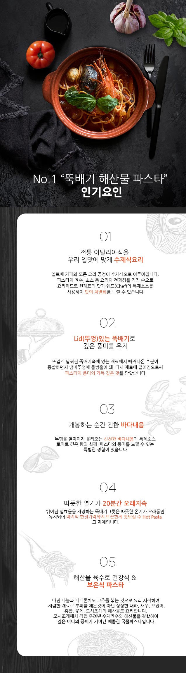 엘르베 레스토랑 카페의 자체통계에 의해 산출된 2021년 상반기 베스트 셀러 파스트의 No_1은 판매점유율 21%를 보인 "뚝배기 해산물 파스타"가 선정되었습니다.