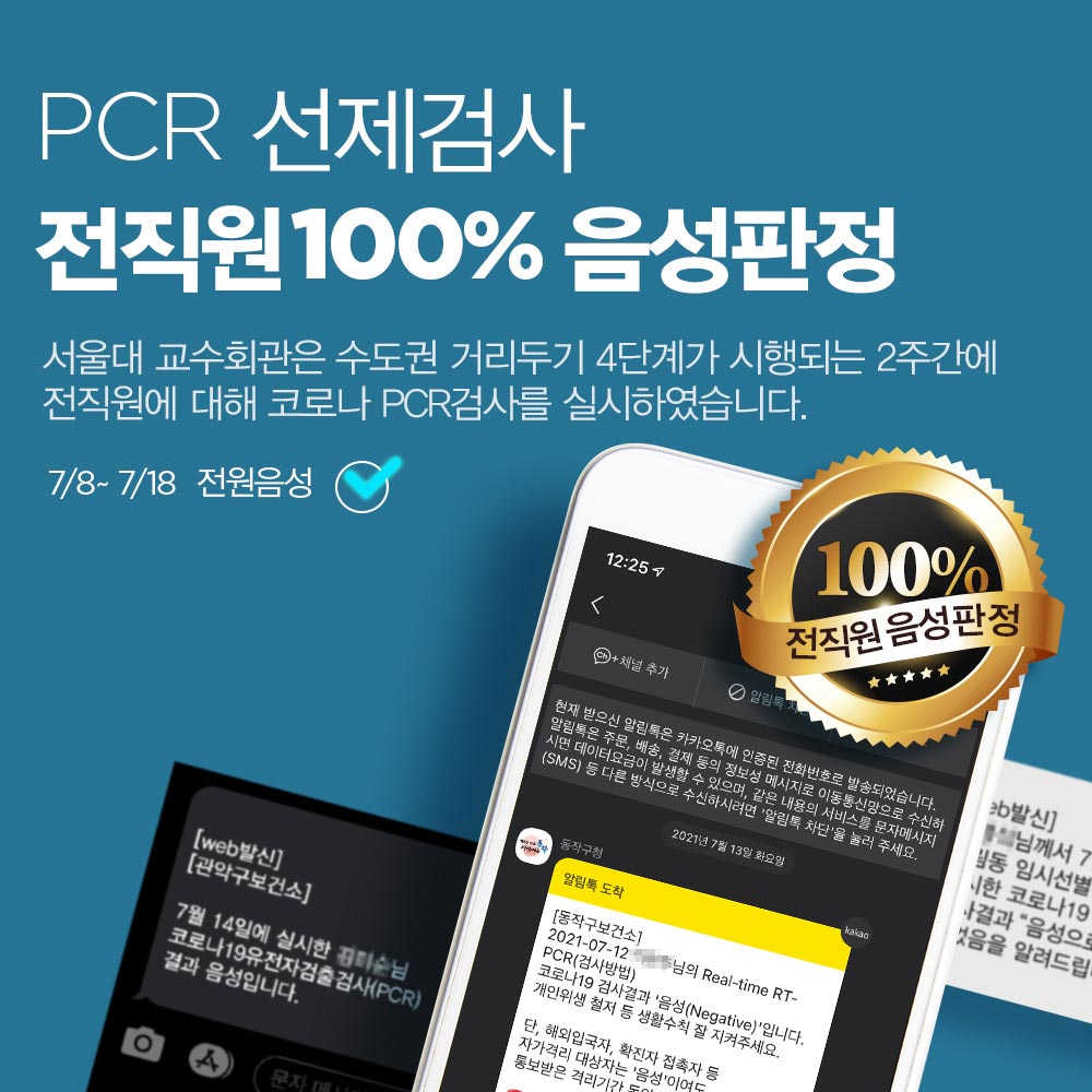 서울대 교수회관은 수도권 거리두기 4단계 시행됨에 따라 웨딩홀에 근무하는 전 직원에 대해 코로나 PCR검사를 실시하기로 하였습니다.