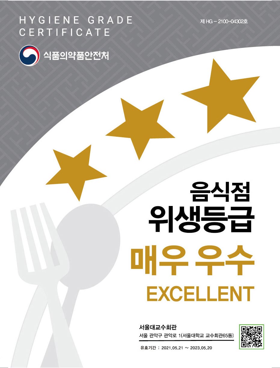 또한, 서울대 교수회관 웨딩홀은 식약처에서 실시하는 위생등급 평가에서 최고등급인 “★★★, 매우 우수”를 획득함으로써 위생경영의 실천도를 외부전문 기관으로부터 객관적으로 인정 받았습니다.