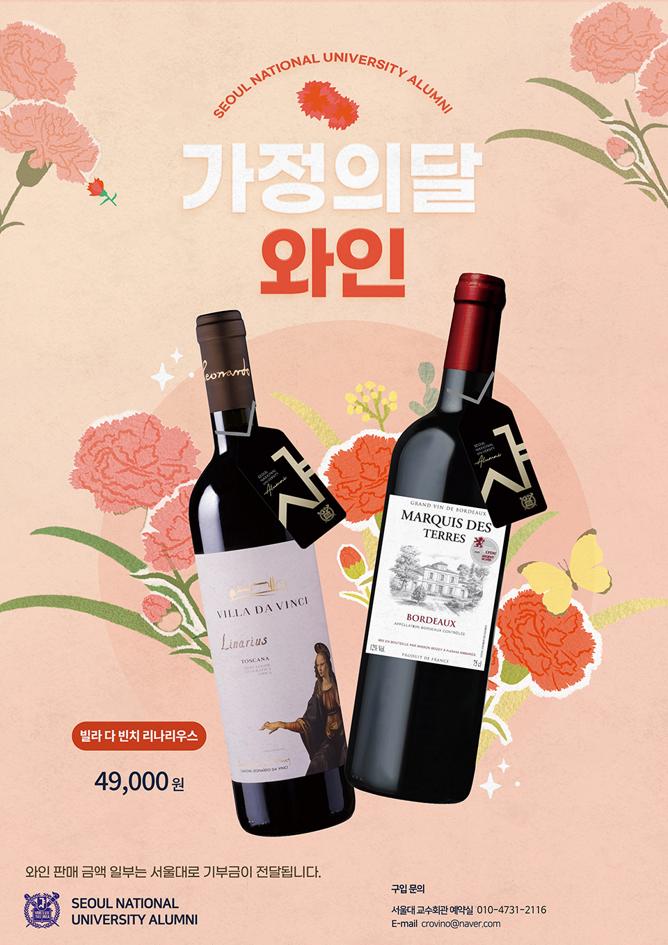 2025.08.205월 가정의달 서울대학교 총동창회에서 준비한 서울대 와인은 사랑하는 부모님께, 늘 곁에서 힘이 되어준 선생님께, 소중한 가족에게 전하고 싶은 마음이 있을 때, 그 마음을 조심스레 감싸 안고 전해주는 품격있는 선물이 되어줍니다.